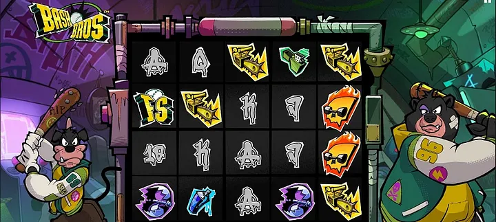 สัญลักษณ์ที่จ่ายน้อยใน Bash Bros จะถูกแทนที่ด้วยการ์ดอันดับ 10-A สไตล์กราฟฟิตี้ ซึ่งจ่าย 0.3 เท่าของเดิมพันสำหรับชุดค่าผสมที่ชนะห้าชนิด สัญลักษณ์ที่จ่ายสูงจะรวมถึงไฟแช็ก กระป๋องสเปรย์ กับดัก เลื่อยโซ่ และชิ้นส่วนสเก็ตบอร์ด โดยมีการจ่ายเงินระหว่าง 1x ถึง 2x ของเดิมพัน.